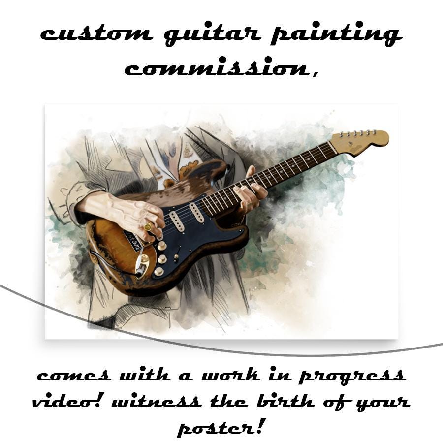 Immerse your beloved electric guitar, bass guitar, or acoustic guitar in a distinctive digital portrait that captures its soul. Drawing from my own fervor for playing electric guitar, I invest passion and dedication into every commission painting, preserving the instrument's essence and charm while faithfully depicting each scratch and wood grain. Tailored and adaptable, each painting is meticulously crafted to embody the uniqueness of your treasured electric guitar.